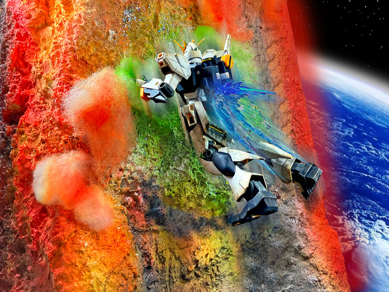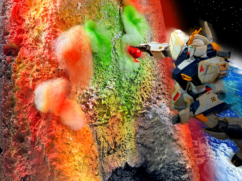 ジオラマ全体としては限られたスペースの中で当初MS4機を岩盤から棒で突き刺すことも考えましたが、重量バランスを考えて断念しました。結果的に手持ちのトリプルアクションベースを改造することで安定して4機をディスプレイすることが出来ました。