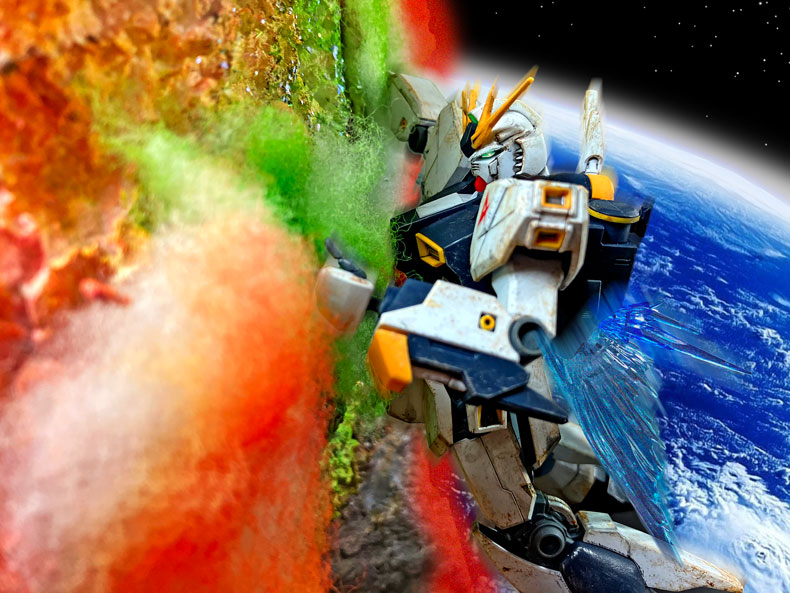 アクシズ・ショックをイメージしてνガンダム、ジェガン、ギラ・ドーガ、ジムⅢの順で製作を始め、ウェザリング後最終的にジオラマ化します。