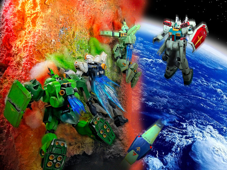 GUNDAM SIDE-Fオープン以来ディスプレイされていたアクシズ・ショックのジオラマに刺激され、約2年ジオラマ製作の構想を温めてきました。その間νガンダムに始まり、ジェガン、ギラ・ドーガ、ジムⅢを転売ヤーに手を出すことなく収集しました。