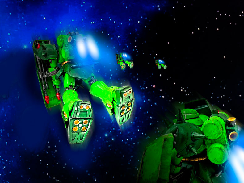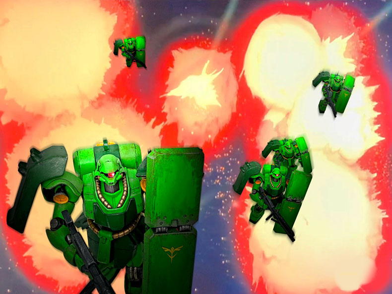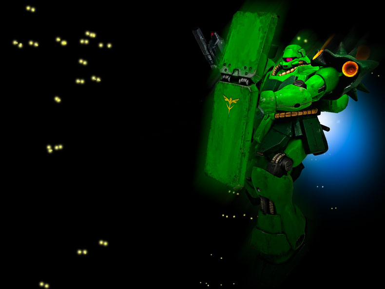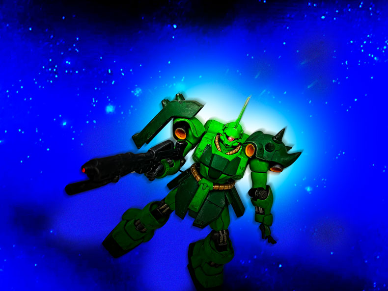 製作ポイントとしては装甲色を暗い量産型ザク系の色味から、劇中の配色に近い明るいグリーンに変える決断が必要でしたが、正解だったと思います。地球連邦軍のMSとの差別化と言う意味でも発色の異なる機体としてアクセントが効いてると思います。