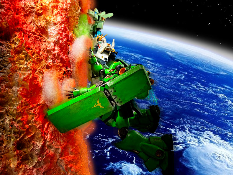 後ハメ加工やパーツの合わせ目消しなどの工作は順調に進みましたが、控え目を意識しなければならなかったウェザリングはアクシズ・ショックのジオラマ4機の中では一番汚し過ぎたかもしれません。