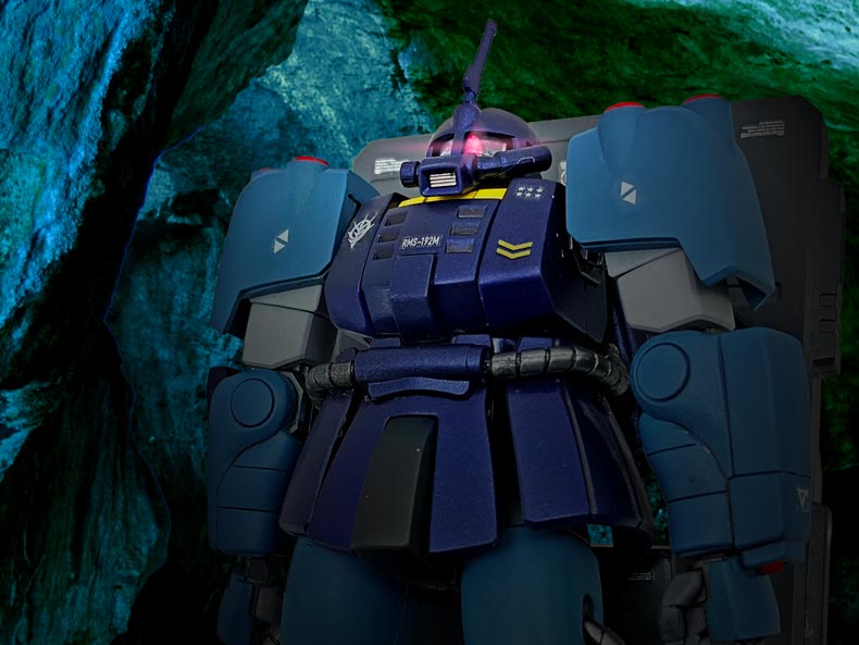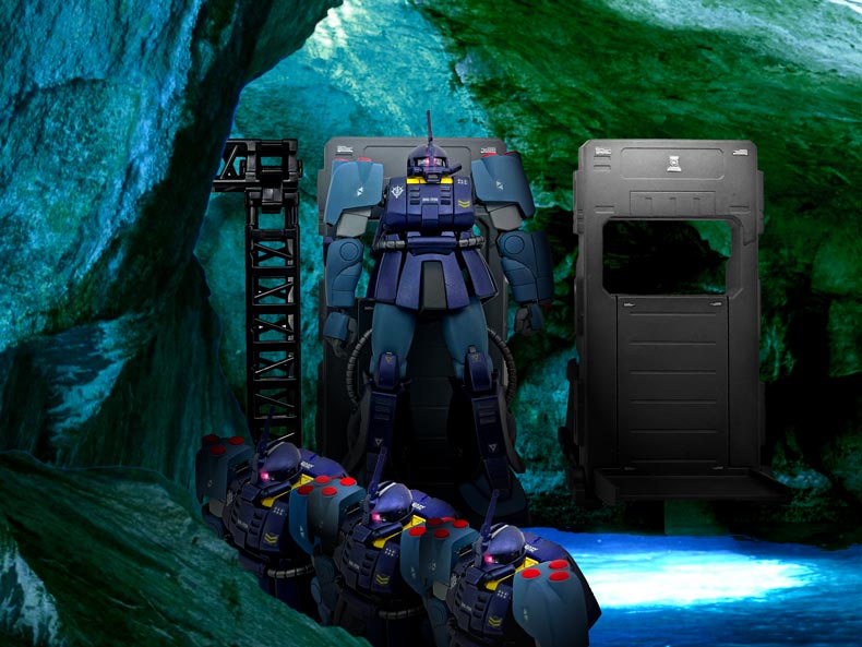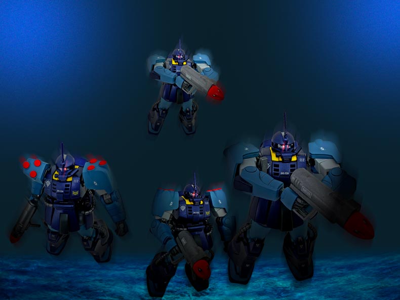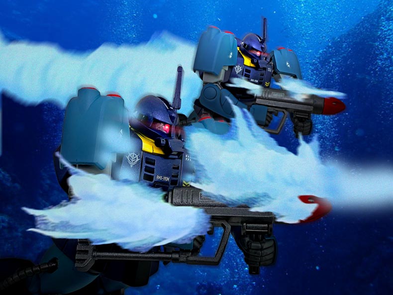 肩部とハイドロジェットを内蔵したバックパックにはサブロックが計14発、左腕にはマグネット・ハーケンが装備され、4連装スプレーミサイル・ガンを装備しています。 頭部は指揮官機はブレードアンテナ、一般機はロッドアンテナを標準装備し、モノアイレールは全周式となり、更に上方向も向くことが可能となっており、潜航時前方を視認することが出来ます。