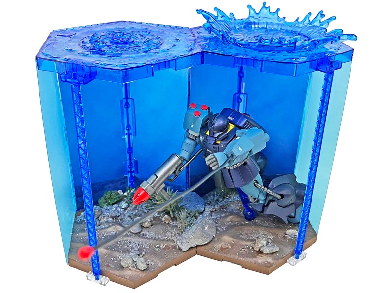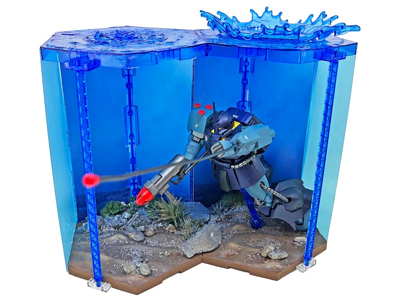 当初はコレクションケースを水中ジオラマ化して、すべて手作りのジオラマベースを製作する予定でしたが、製作直前にガンダムベース福岡で「カスタマイズシーンベース (水上Ver.)」が再販されいるのを発見。2個組み合わせたディスプレイに刺激されて予定を変更しました。