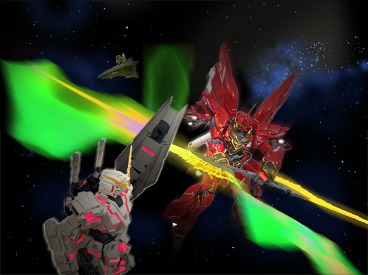 すべてのパーツを組み上げ、シーンに応じたそれぞれ武器を装備したら、いよいよ完成です! HGフルアーマー・ユニコーンガンダム同様バックパックが重すぎてアクションベースなしでは自立できないため、古いキットでもある「アクションベース1 シナンジュVer. 」を入手しました。黒色パーツのみセミグロスブラックを吹きました。このキットはデカールの見本がデタラメなので、何度もやり直して仕上げに「Mr.スーパークリアーつや消し」を吹きます。 |