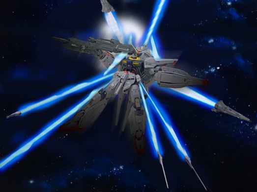 すべてのパーツを組み上げ、台座にのせてドラグーンを支柱のクリアパーツに組み替えて射出、ビーム・ライフルを持たせ、ビーム刃を付けたらいよいよ完成です! |