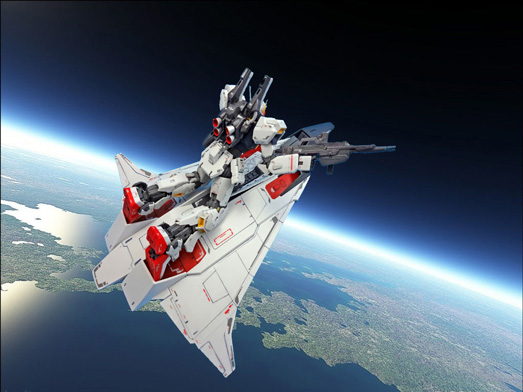 | 思い入れのあるMk-Ⅱは構想・素材集めから時間を掛け、ティターンズ仕様を2機製作したノウハウを投入しただけに満足のいく仕上がりとなりました。 フライングアーマーが思った以上に大きかったため、本来予定していたジャブロー流域の密林を植えつけることはできませんでしたが、シンプルながらも鮮やかな水面が出来ました。 また、豊富な武器とフライングアーマーのコンビネーションでカッコいいポージングが楽しめ、お気に入りの写真も多数撮影することが出来ました。 |